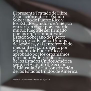 El presente Tratado de Libre Asociación entre el Estado Soberano de Puerto Rico y los Estados Unidos de América entrará en vigor por acuerdo mutuo luego de ser firmado por los representantes del Estado Soberano de Puerto Rico y de los Estados Unidos de América, y al ser refrendado mediante el voto directo por el pueblo de Puerto Rico y aprobado por los organismos pertinentes del gobierno de los Estados Unidos América según el Artículo II, Sección 2, Cláusula 2 de la Constitución de los Estados Unidos de América1.