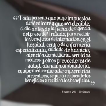 I. Toda persona que pagó impuestos de Medicare y que sea elegible, el día antes de la fecha de vigencia del presente Tratado, para recibir los beneficios de internación en el hospital, centro de enfermería especializada, cuidado de hospicio, atención domiciliaria, servicios médicos y otros proveedores de salud, atención ambulatoria, equipo médico duradero y servicios preventivos, seguirá recibiendo los beneficios o recibirá los beneficios según establecido por la Ley de Contribuciones al Seguro Federal o la Ley de Contribución al Autoempleo, efectivo en la fecha de vigencia del presente Tratado1.