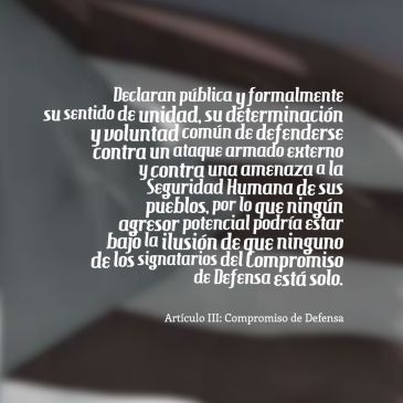 IV. Declaran pública y formalmente su sentido de unidad, su determinación y voluntad común de defenderse contra un ataque armado externo y contra una amenaza a la Seguridad Humana de sus pueblos, por lo que ningún agresor potencial podría estar bajo la ilusión de que ninguno de los signatarios del Compromiso de Defensa está solo en la zona de América Latina, el Caribe y América del Norte.